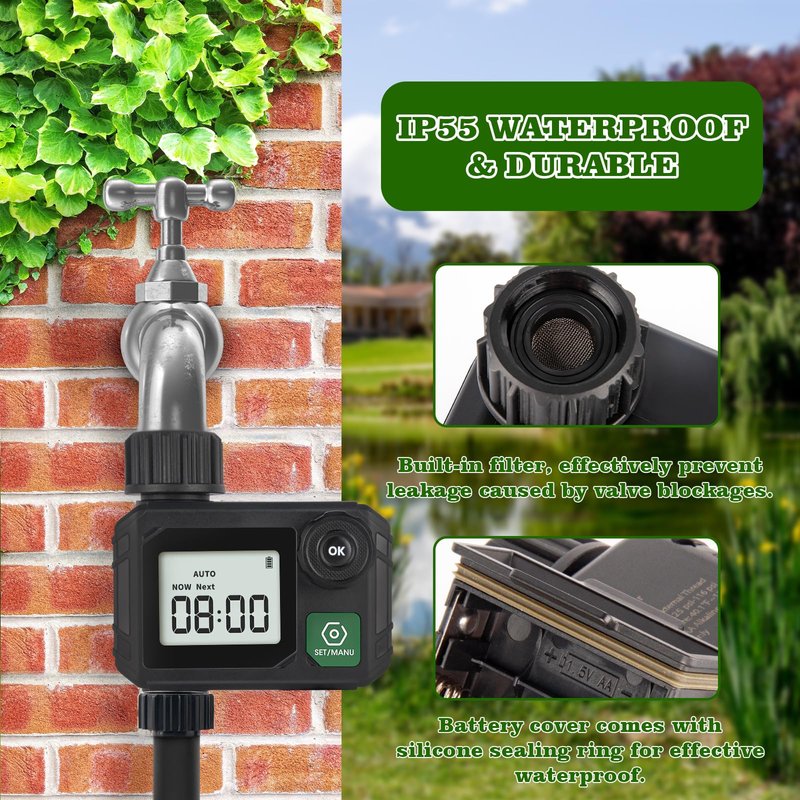 - The garden hose timer has IP55 level waterproof, and the battery compartment has a built-in sealing strip to prevent water from entering, which gives the water timer a long service life. Besides, it has a waterproof circuit board and energy storage circuit design, ensure the duration of this water timer.
