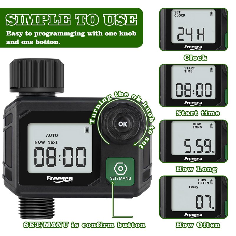 - 365 Days Warranty: Manual mode is available for this drip irrigation timer, flexibly set the manual watering duration(1-59min). And it has a 12-month warranty, if you have any questions about watering timer you've received, please feel free to contact us.