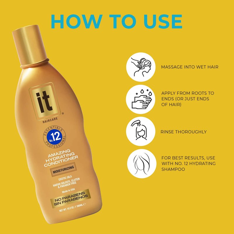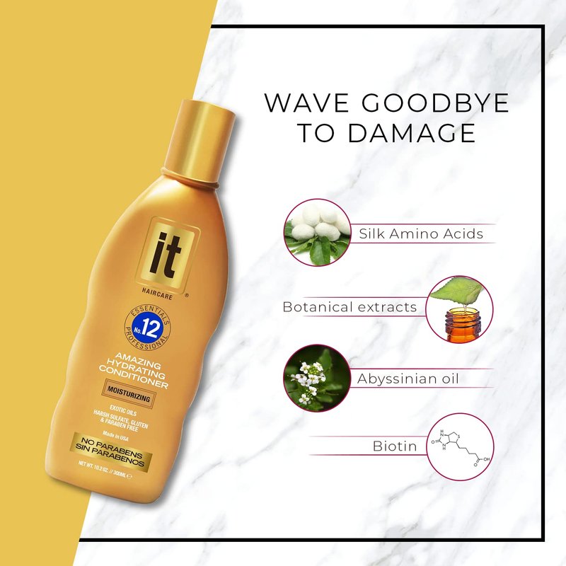 - IT Essentials No. 12 Amazing Hydrating Conditioner This ultra-hydrating, professional-grade formula nourishes, restores, and deeply conditions for luxurious hair! Saturated with moisture-rich ingredients like Abyssinian Oil, biotin, natural keratin, and botanical extracts from flowers, nuts and fruits to repair, protect, and strengthen dry, damaged hair, while improving manageability and fighting frizz. Gentle enough for daily use and perfect for all hair types. 10.2 oz bottle.