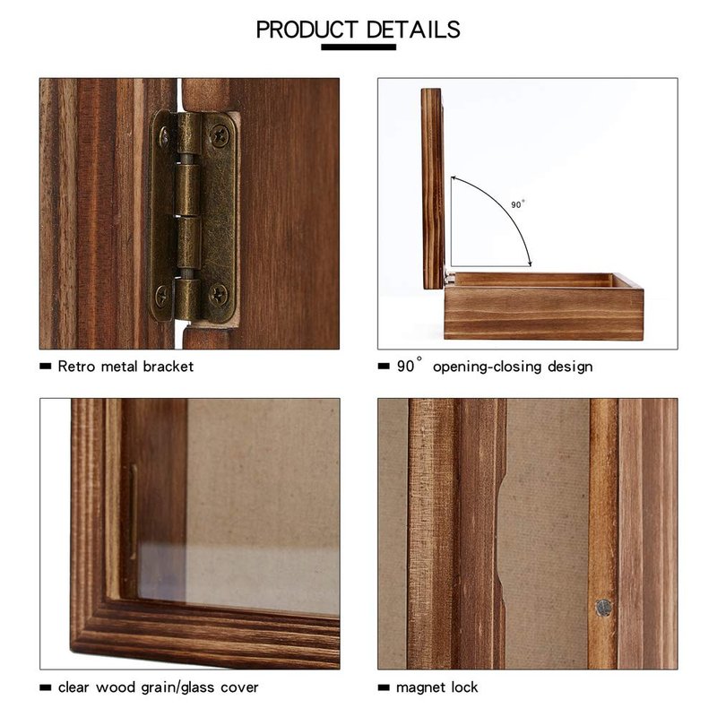 - Materials:Small wood shadow box, Retro Carbonized process, 3 mm thick high-clarity glass, soft linen plate, retro style accessories, magnetic opening-closing design