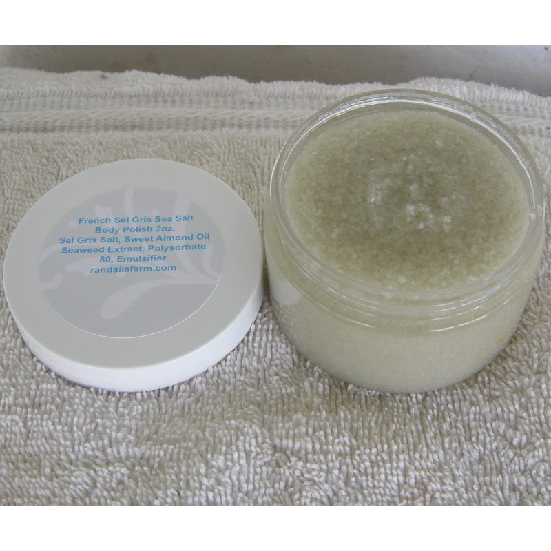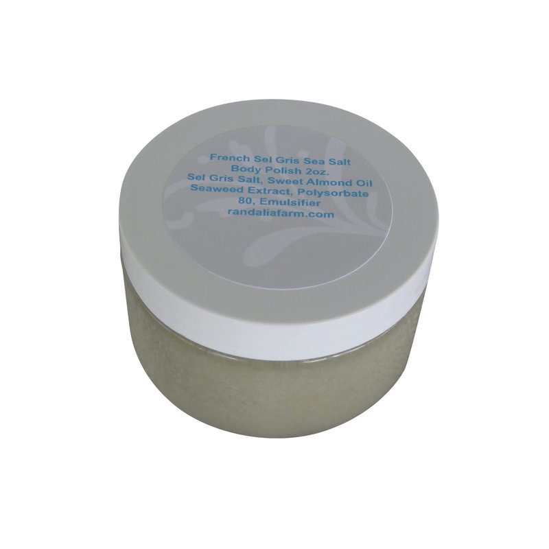 French Sel Gris Sea Salt Body Polish. 7 oz. Plastic Jar with Screw on Lid. Ingredients include Fine Sel Gris Salt, Sweet Almond Oil, Seaweed Extract, Polysorbate 80, Emulsifier. Exfoliant, Moisturizer. Unscented. Hand Crafted in Maryland, USA.