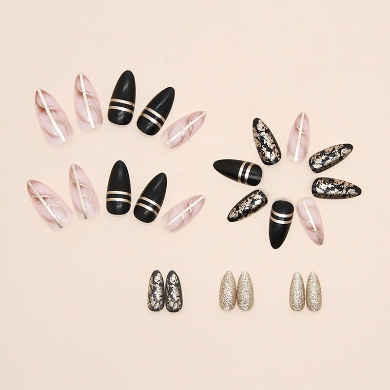 24Pcs Press on Nails Almond Medium, with Gold Line Shine Design Black Pretty Fake Nails Set for Women Manicure Decorations.