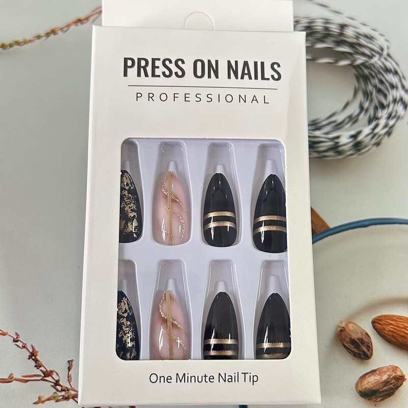 - 【Fashion Design】Unique design, our false nails are made with high quality ABS material, they are will not harm your hands, you can use it with confidence. With gold line shine design black fake nails give you fashion and luxury felling.