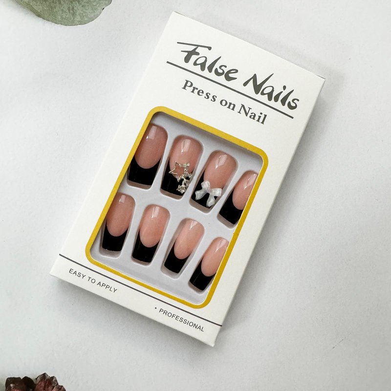 French Tip Press on Nails Black Fake Nails Medium Length False Nails Square Acrylic Nails with Bow Star Charm Designs Cute Artificial Nails Full Cover Glossy Stick on Nails Bow Glue on Nails for Women
