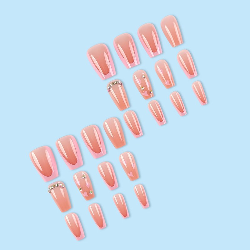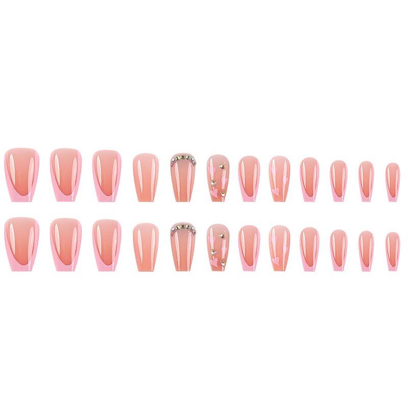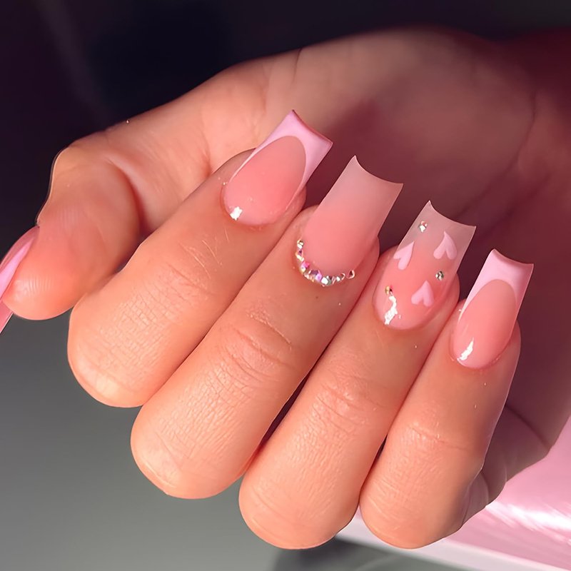 French Tip Press on Nails Medium Coffin Fake Nails with Heart Designs Pink Glue on Nails Cute Full Cover False Nails Rhinestone Acrylic Nails Glossy Stick on Nails for Women Nail Art Decorations