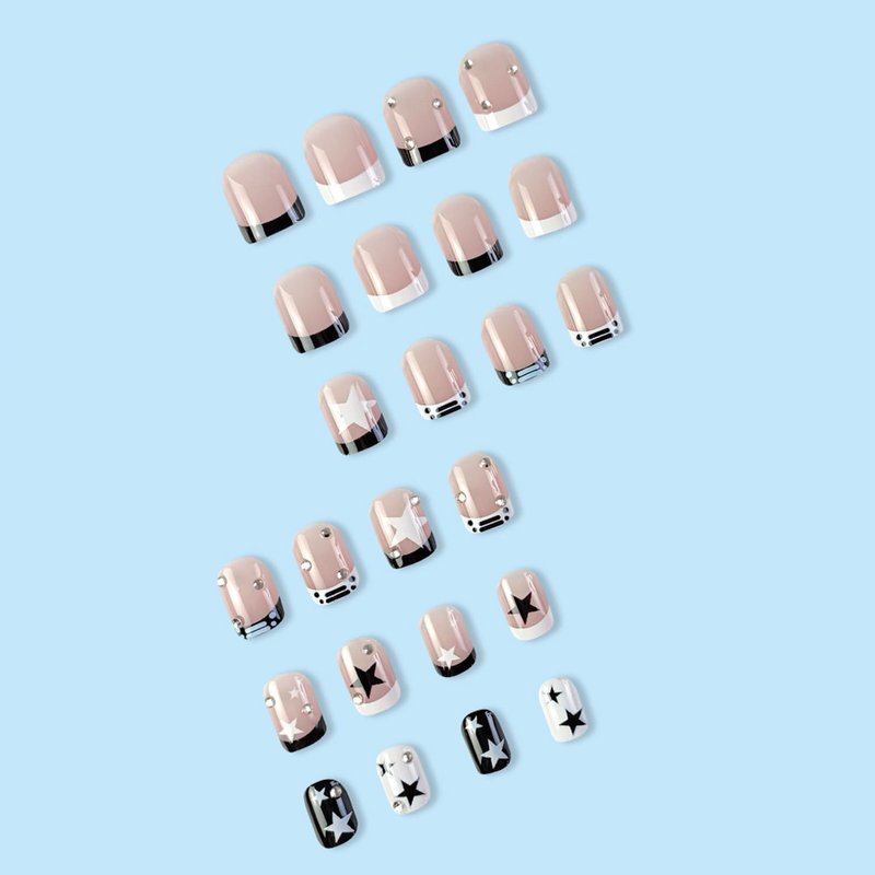 French Tip Press on Nails Short Square Fake Nails Black White Star Rhinestones False Nails Design Glossy Full Cover Artificial Nails for Women Charm Manicure Reusable Stick on Nails Glue on Nails