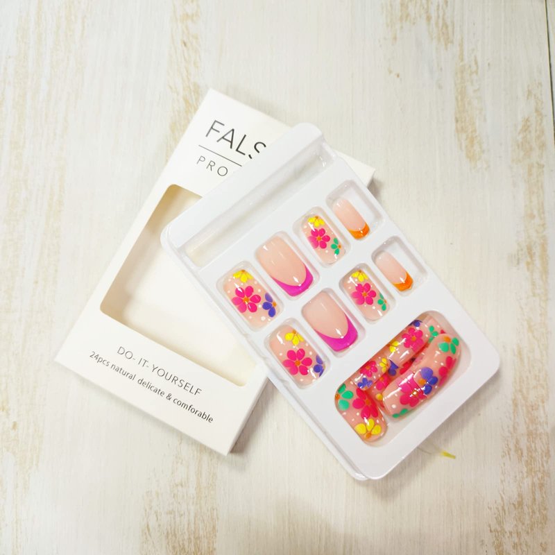- đșăColorful DesignăThis square false nail is uniquely designed with colorful simple flowers, which looks very cute and fun, it is a perfect nail for everyday socializing!