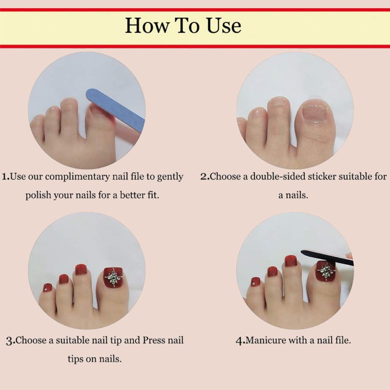- 💗【Easy to Use】The toenail press ons are easy to trim. It only takes 5 minutes to get your favorite press on toes. Clean and polish your toenail, select a right size of the toe press on nails, apply the glue to the back of the nail then press it on your nail for 20 seconds,you get a rhinestones press on toenails!