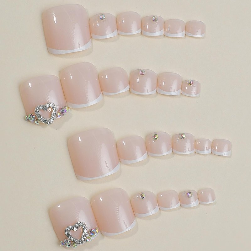 French Tip Press One Toe Nails for Women Fake Toenail with Rhinestones Designs Heart Glossy Fashion False Toenail Full Cover Acrylic Nails Art DIY Foot Nails Design Toenail Tips 24Pcs