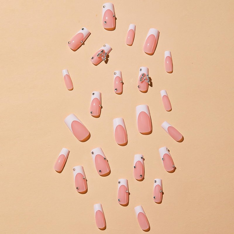 French White Tip Press on Nails Square Medium Fake Nails Acrylic False Nails with 3D Butterfly Designs Rhinestones Artificial Nails Pink Full Cover Nails Press ons Stick on Nails for Women 24Pcs