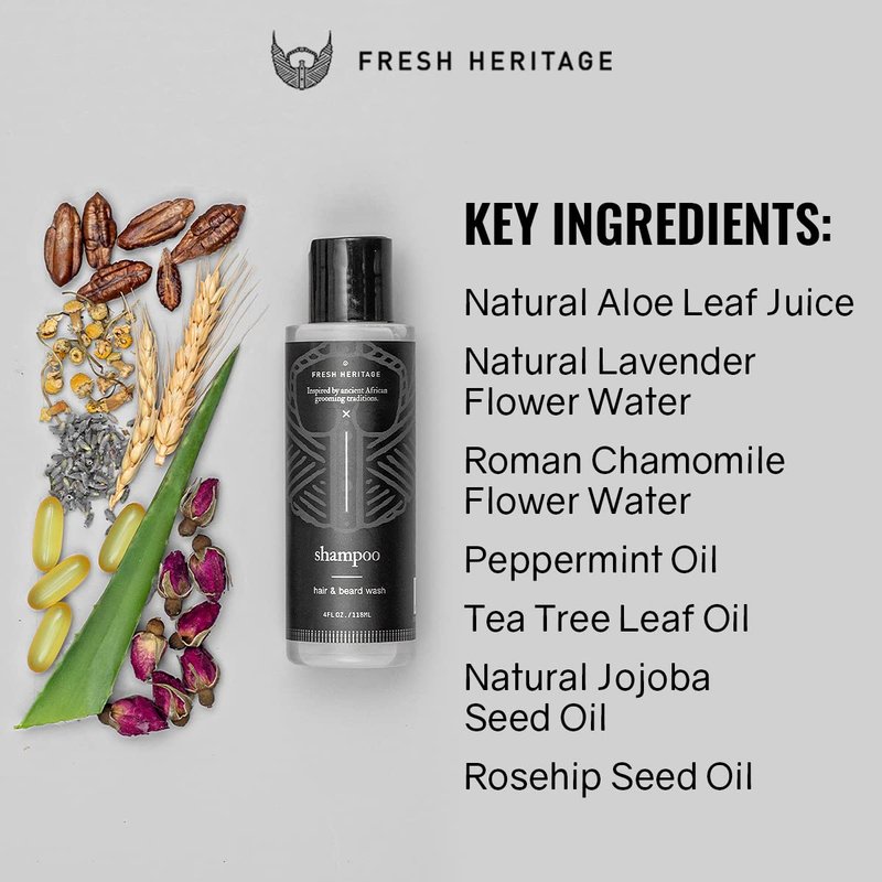 - Ultimate Beard Shampoo for Men- Fresh Heritage's Beard Wash is the ultimate must-have hair care product for men. This hair, face and beard wash is deeply nourishing to the skin and hair. Enriched with aloe juice, peppermint oil, and tea tree oil, our vegan formula adds shine and moisture while stimulating fuller hair growth. The beard shampoo for sensitive skin is gentle enough for everyday use. Invigorating peppermint scent to wake you up and feel energized.