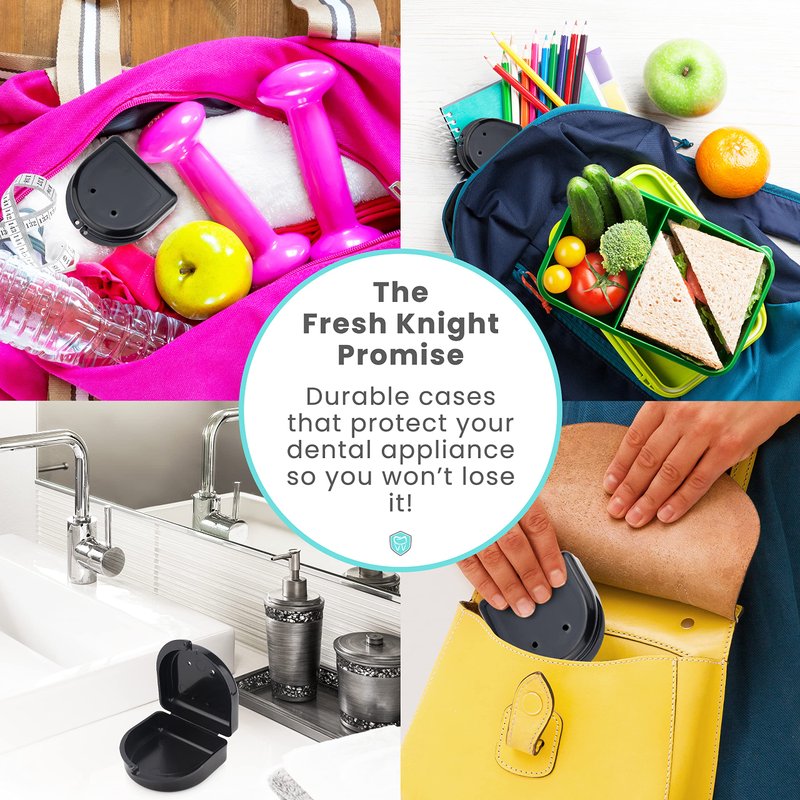 Keep your retainers safe and protected at home and on the go with this convenient 2-pack of Fresh Knight cases. Each case features a durable design made from BPA-free plastic for long-lasting use. The spacious interior comfortably holds two upper and lower retainers or aligners, and even some dentures. Additionally, ventilation holes promote airflow to help prevent odor buildup. For easy cleaning, simply place the case on the top rack of your dishwasher.