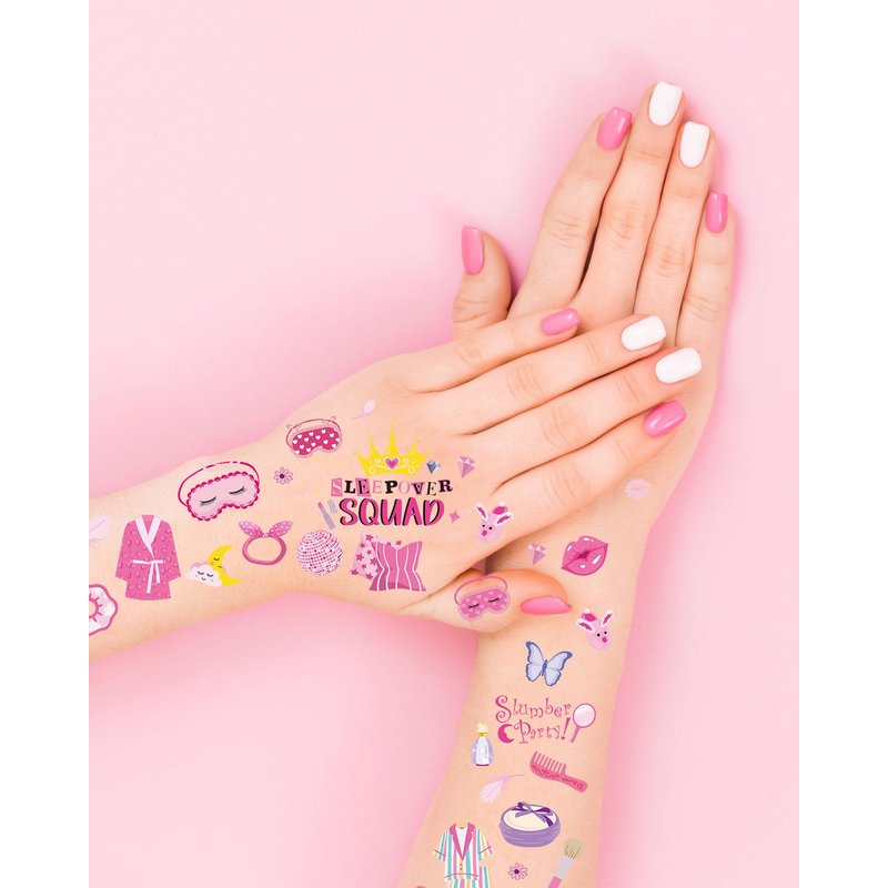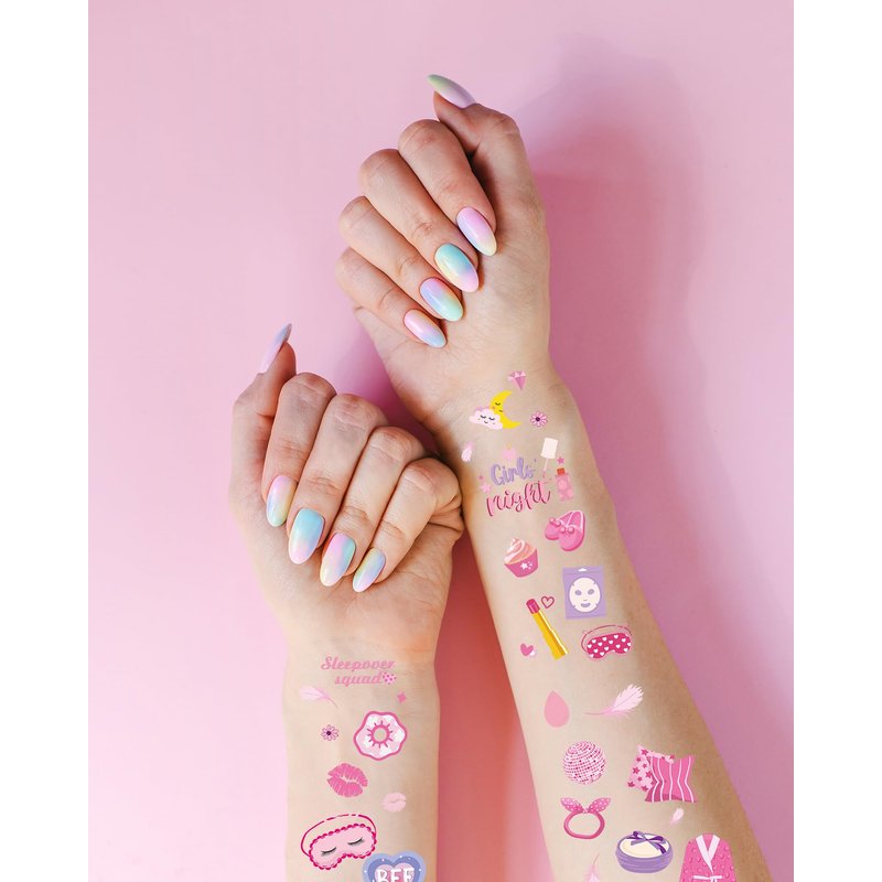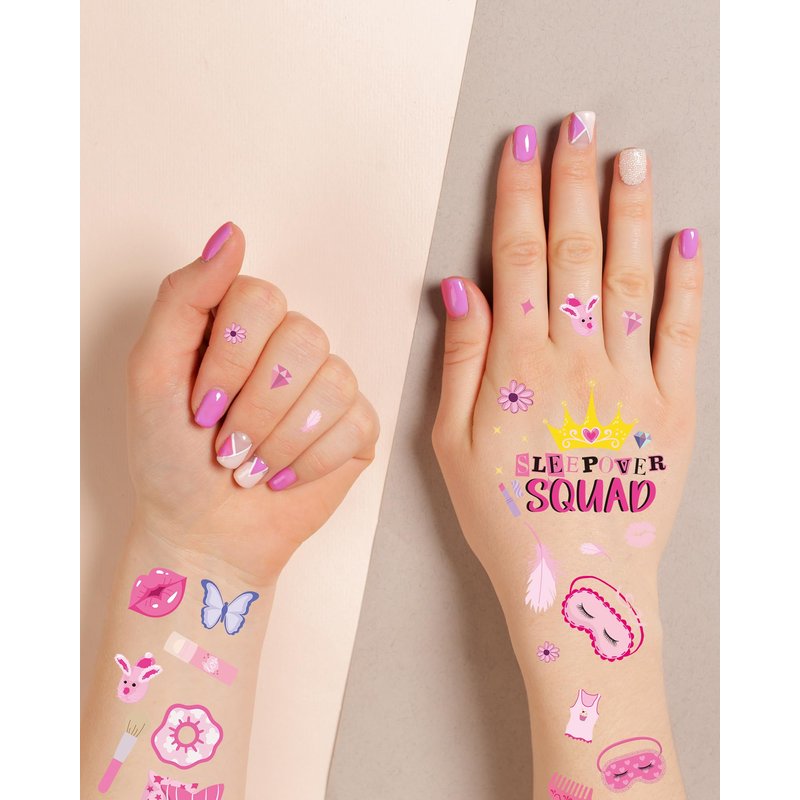 Introducing FRESHME Sleepover Party Temporary Tattoos, the ultimate addition to your girl's night in! With eight sheets of adorable designs featuring our cute pink Sleepover Squad SPA theme, these waterproof fake tattoos are guaranteed to elevate your slumber party to a whole new level of fun. Designed to withstand even the most epic of pillow fights, our tattoos are crafted with waterproof materials, ensuring they stay vibrant and intact throughout the night. Whether you're lounging in pajamas, indulging in a spa session, or having a movie marathon, these tattoos will add a touch of whimsy to every moment. But the fun doesn't end when the party does! Each tattoo serves as a memorable souvenir, allowing every guest to take home a piece of the Sleepover Squad experience. From spa symbols to slumber party essentials, these tattoos will remind everyone of the laughter and joy shared during your unforgettable night in. Make your next sleepover one to remember with FRESHME Sleepover Party Temporary Tattoos. Get ready to unleash your inner Sleepover Squad and create memories that will last a lifetime!