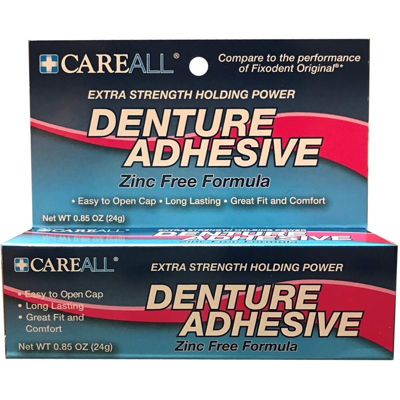 This item is sold by cases of: [24] oz denture adhesive compares to the performance of Fixodent strength holding power and long lasting great comfort fit. oz. squeeze tube Easy Open Cap Zinc Free 24 in each case Retail Packaging