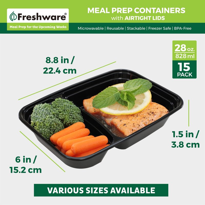 Freshware Meal Prep Containers [15 Pack] 2 Compartment with Lids, Food Storage Containers, Bento Box, BPA Free, Stackable, Microwave/Dishwasher/Freezer Safe (28 oz), Black