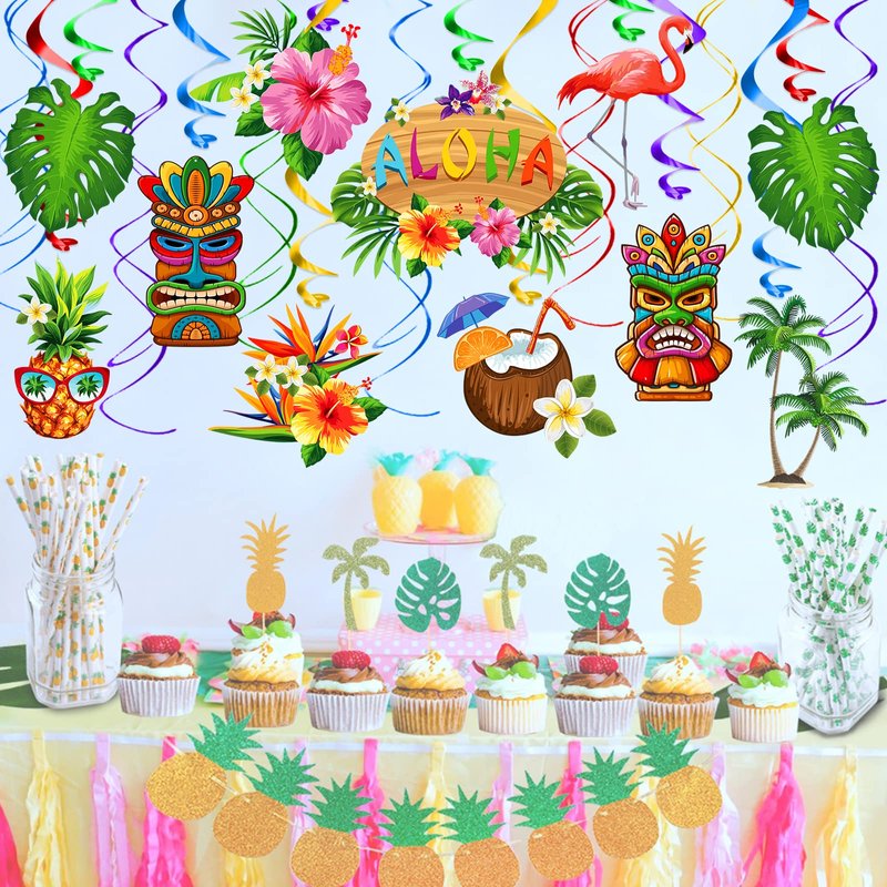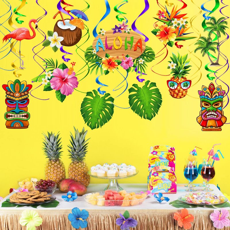 - This Hawaiian Luau birthday party decorations is suitable for Hawaiian Tropical party summer beach party, pool party, Tiki party, so on; You just need to assemble these hanging swirls and hang them from walls, the ceiling, in a doorway, tree branches in your backyard for outdoor indoor parties; Make a memorable experience for you, your friends and families atmosphere