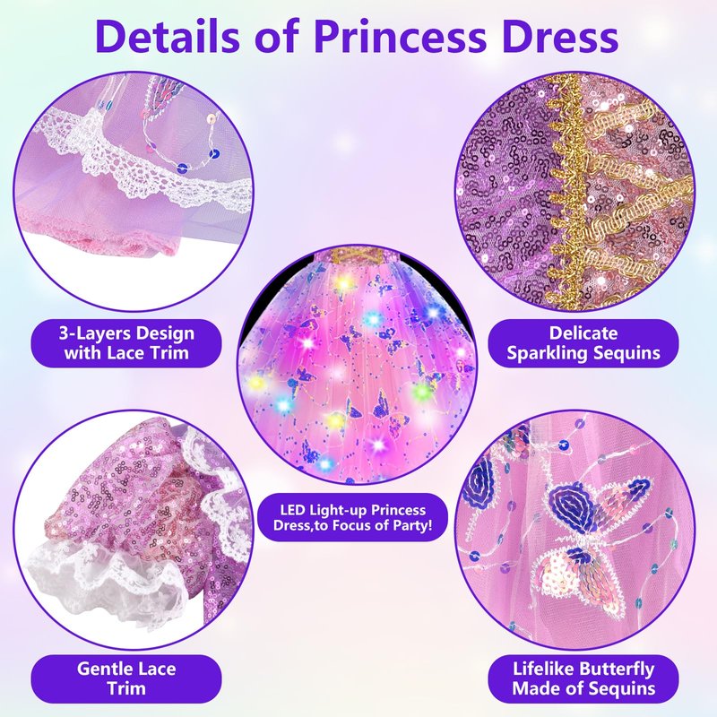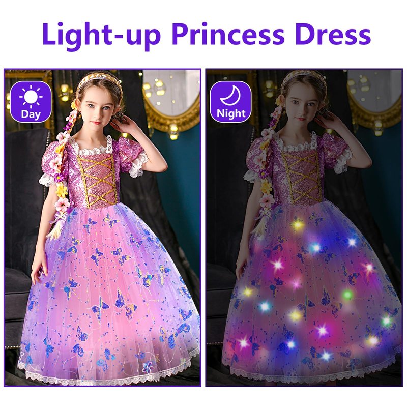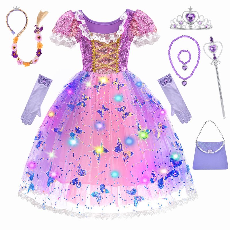 This is beautiful princess dress. It included dress, wand, crown, braid, jewelry set. And it can be light-up. Also, it's good princess costume for girls. Girls can play role in princess to wear this toddler dress up clothes. Good gift for girls