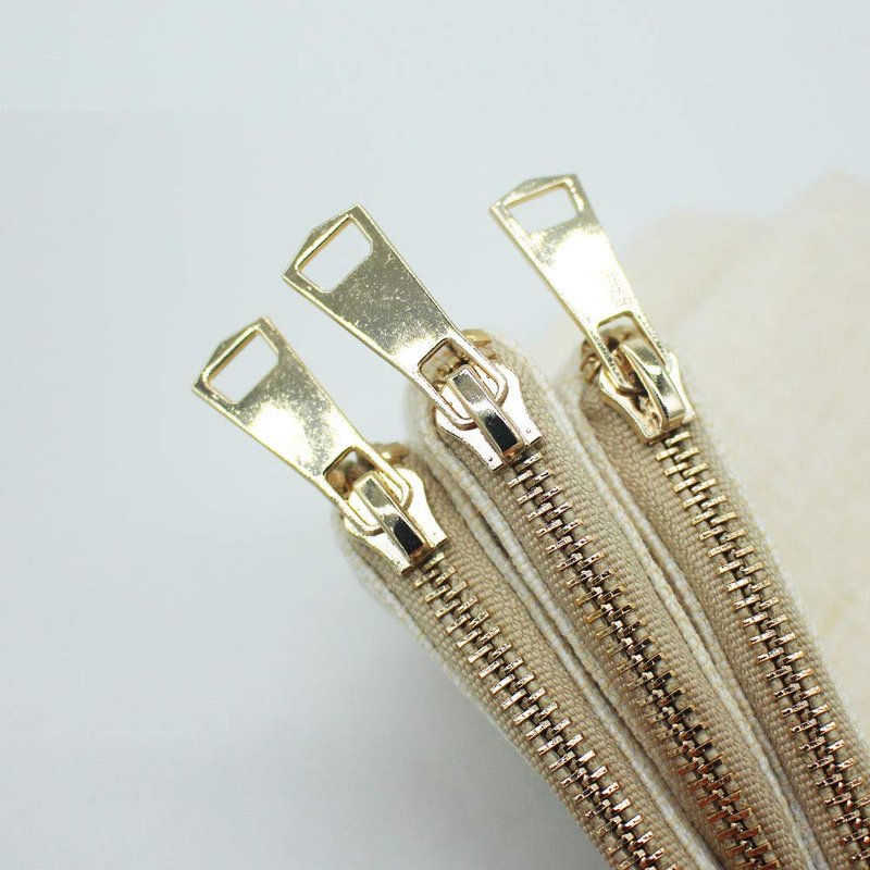 - Color: Beige, featuring a golden brass zipper with a fashion pull.