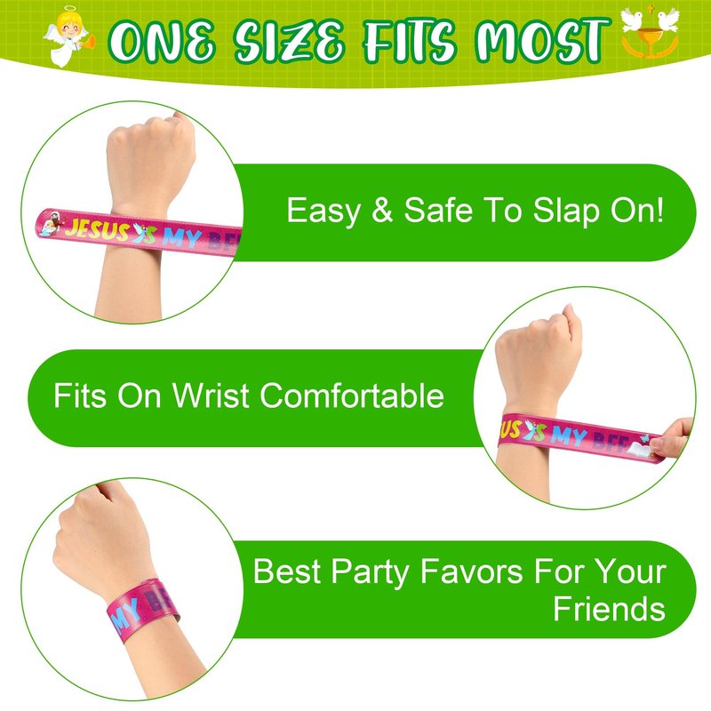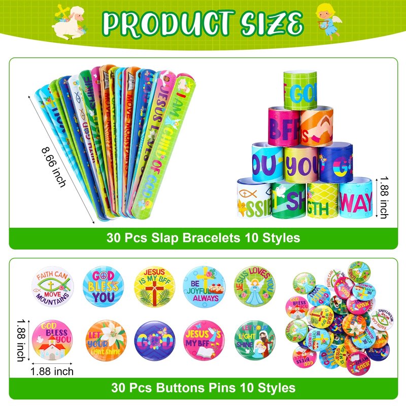 Features: Sunday school supplies: Our Sunday school party supplies have many motivational bible verses, vivid color and clear pattern, easy to attract children's attention and cultivate their interest of learning bible, as gifts for them, besides, ideal for religious activities, Christmas, Easter and more. Jesus religious elements: Our christian party favors feature vibrant colors, printed with cartoon images of Jesus and angels, and many motivational bible verses, full of religious meaning, every one can choose their favorite styles and bible quotes, which would be an addition to your christian religious party supplies. Specifications: Material: Slap wristbands and button pins: PVC material Bookmarks: card stock Color: multicolorSize: Jesus slap bracelets: 8.7 x 1.2 inches/ 22 x 3 cmBible verse buttons pins: 1.2 inches/ 3 cm in diameterBible paper bookmark: 6 x 4 inches/ 15 x 10 cmPackage includes: 30 x Christian slap bracelets30 x Religious mini buttons50 x Jesus stickers60 x Bible verses bookmarksNotes: Manual measurement, please allow slight errors on size. Due to the screen display, the color of the item may differ slightly from the picture.