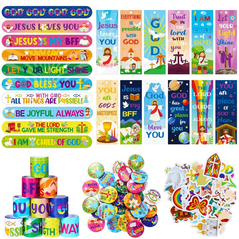 - Religious Party Favors: you will get 170 pieces of christian gifts for kids, including 30 pieces of christian slap bracelets, 30 pieces of religious mini buttons, 50 pieces of Jesus stickers bulk and 60 pieces of bible verses paper bookmarks, which have 10, 10, 50 and 12 styles respectively, rich quantities and multiple styles can meet your needs for Sunday school religious party favors, birthday party gifts or classroom prizes