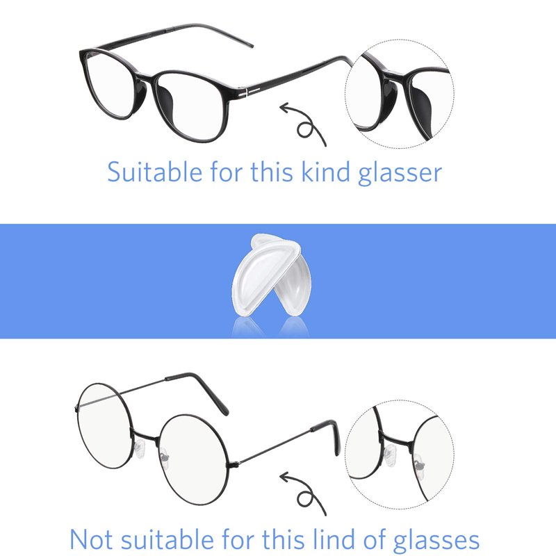 - Widely applicable: the adhesive glasses nose pads can match well with various kinds of plate optical frames, plastic eyeglasses, sunglasses, spectacles, etc., but not for frame whose nose pads need to fix with screw