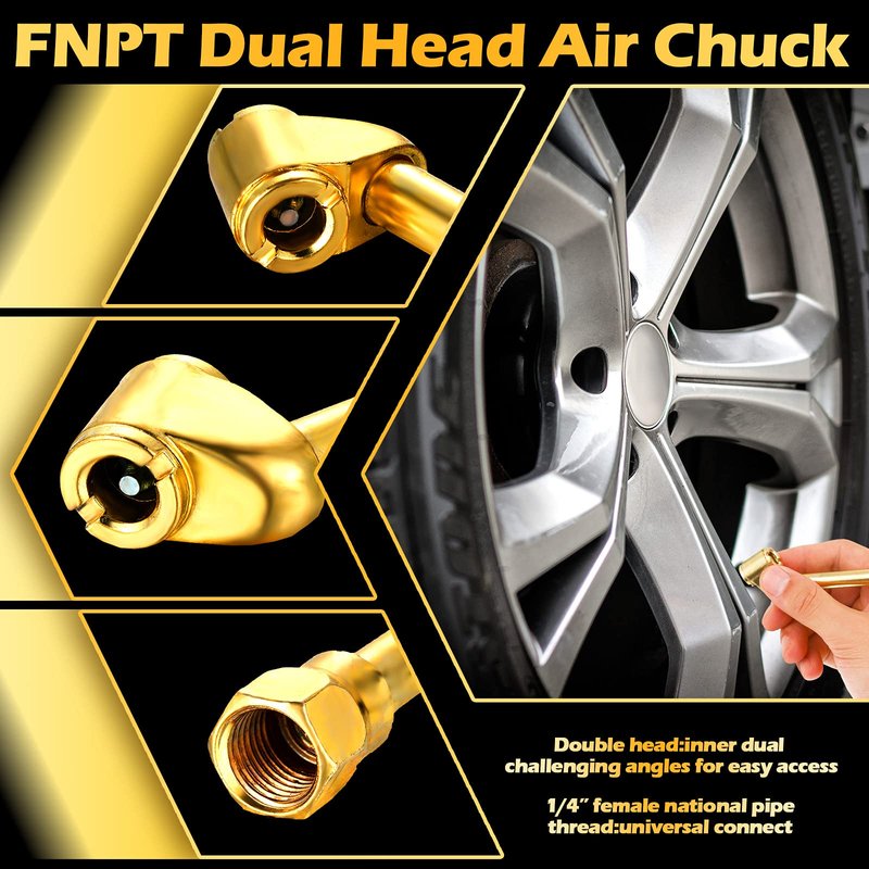 - Package include: our package come with 2 pieces 1/4 inch closed ball air chuck, 2 pieces 1/4 inch dual head NPT male end air hose pipe fitting, 2 pieces tyre valve stems and 2 rolls seal tapes, the complete combination will meet your use needs