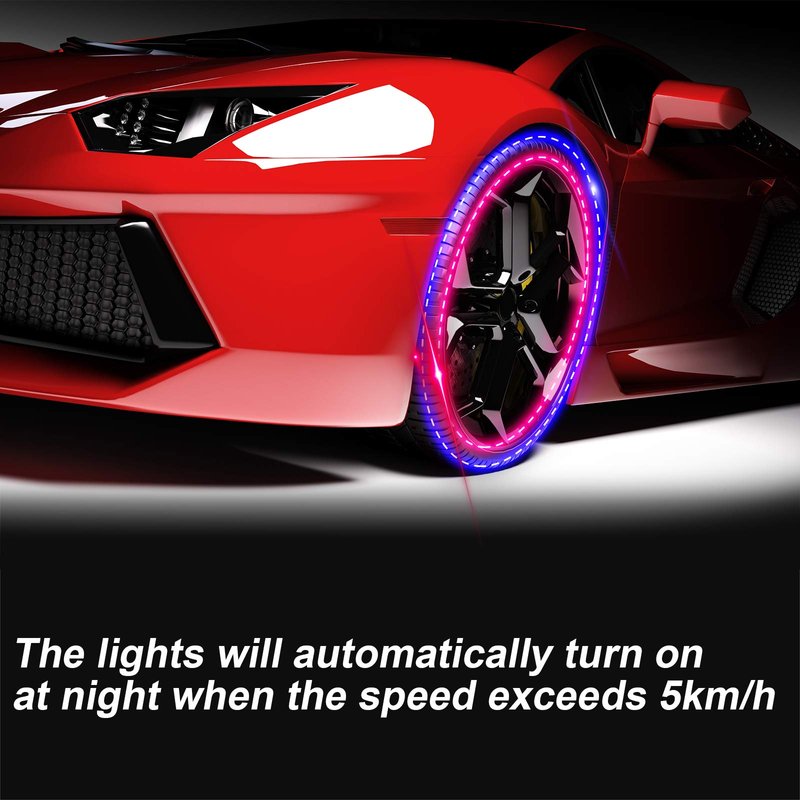- Solar Energy: the car tire wheel lights are able to turn on when the vehicle is moving and turn off when it stops, you can also press the button for a while to turn on/off the light, which feature solar charging and the lithium battery power storage, no battery and wiring required, so you don't need to replace battery, efficient and practical to use