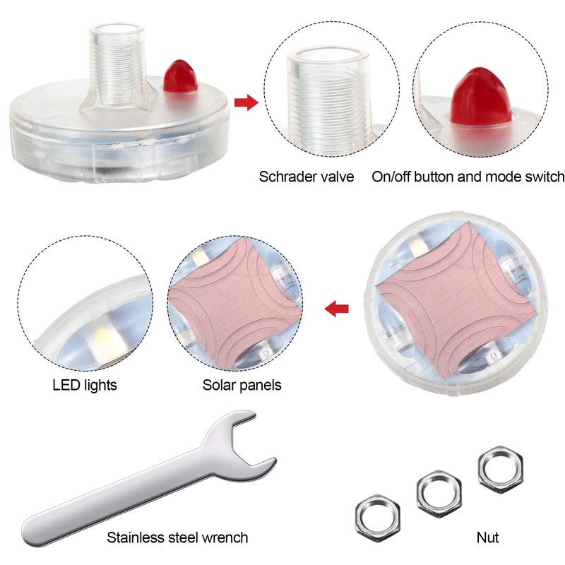- What to Get: you will receive enough amount of solar energy flashing car tire lights and wrench, you can use one light to decorate your car and the rest as a backup, or to share some of them with your office colleagues, family members, lovers, classmates and so on