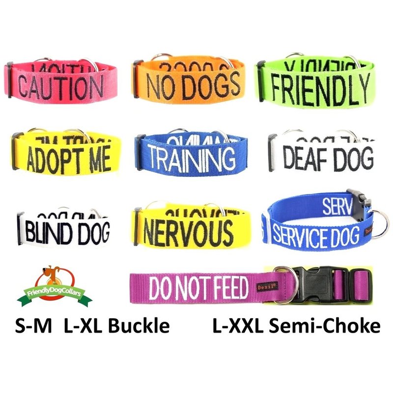 Dexil Ltd/FriendlyDogCollars have created color coded dog collars, leashes, harnesses & coats to assist with dog walking and prevent unwanted attention and dog accidents. These worded embroidered bright colored dog awareness products are designed with safety in mind to aid other dog walkers and children from a distance what type of nature of the dog is approaching them. We are confident that this color coded system could assist with preventing the number of dog bites/attacks and reduce unprompted fights between dogs whilst on a walk. Also with the other items, others can be pre-warned about a certain dogs other needs in advance. By being pre-warned about a certain dogs temperament, so many situations can be avoided cutting down on the 7 million dog bites on adults and children worldwide each year. By using these, you could also save $$$'s on vets bills or possible court fees. WHY WAIT UNTIL IT'S TOO LATE? GET YOUR'S NOW! Created, designed, registered, trademarked, copyrighted by Dexil Limited/FriendlyDogCollars.
