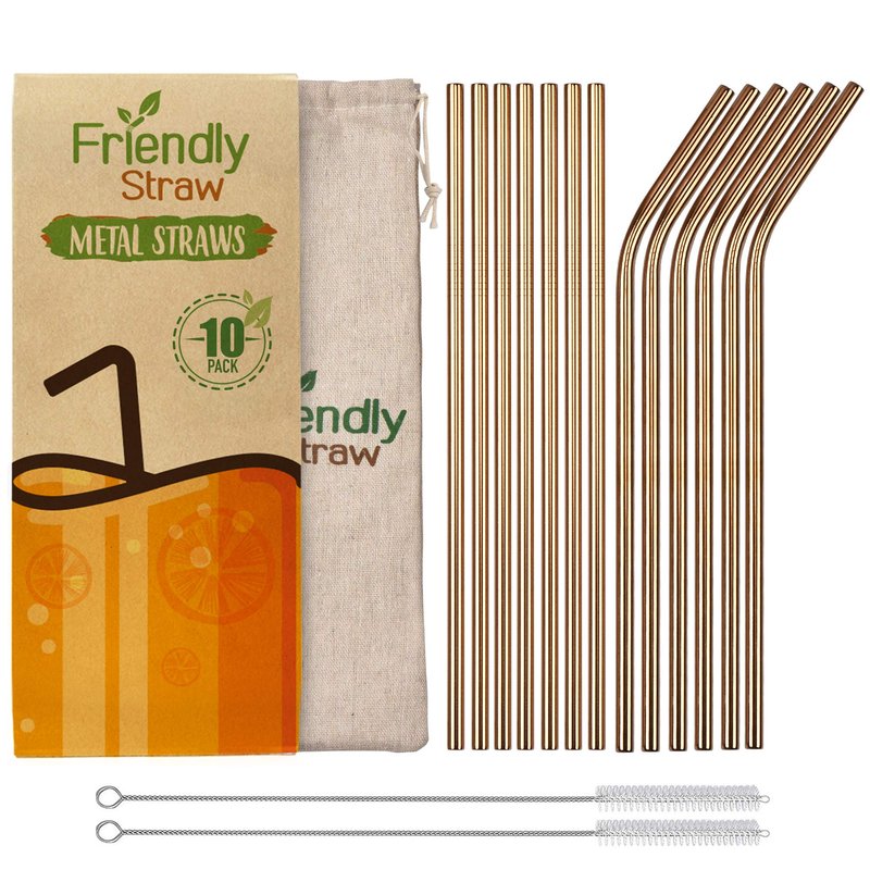 Friendly Straw 10 Pack 8.5" x .25" Reusable Metal Straws, 5 Straight 5 Elbow Stainless Steel Drinking Straws With Free Brushes and Pouch (Copper Finish)