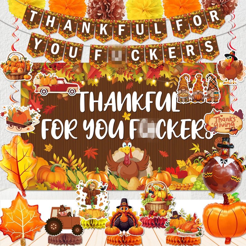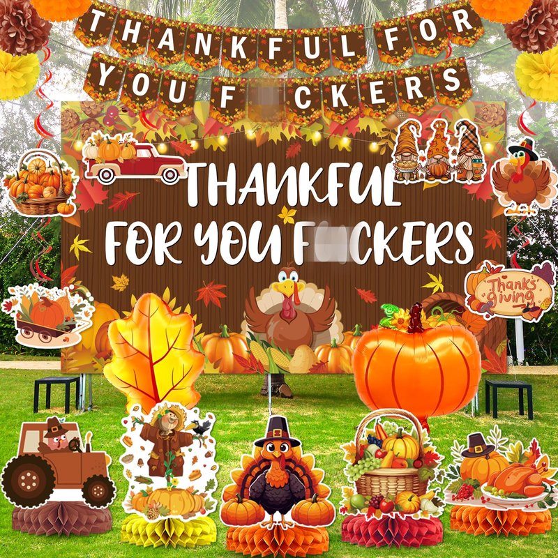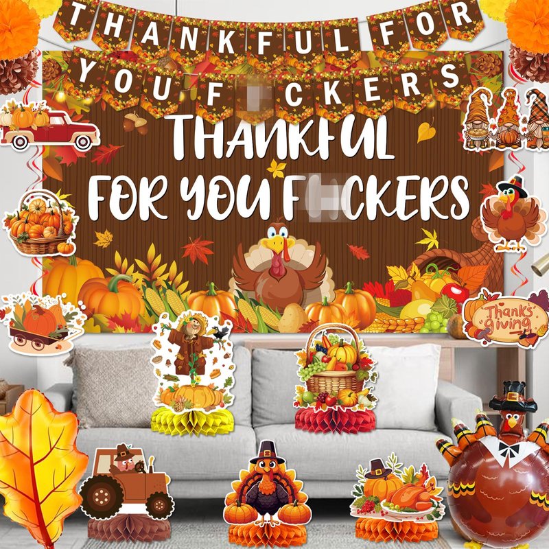 - Package include:1*Thankful for You Banner, 5*Thanksgiving themed centerpieces, 6*fall themed cutouts with hanging swirls, 1*Thanksgiving backdrop, 4*big Thanksgiving balloons( Pumpkin, maple, turkey), 6*paper flowers, sufficient quantity for your Thanksgiving Themed party.
