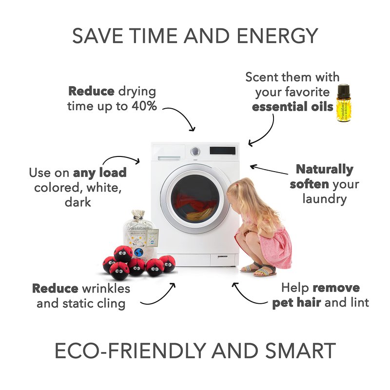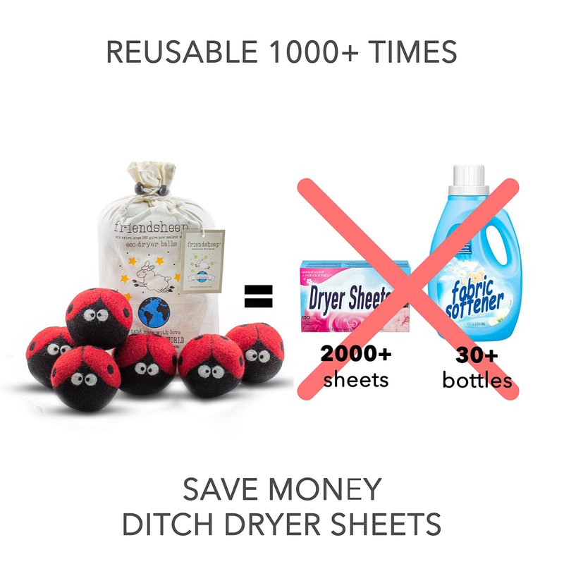 Friendsheep Eco Dryer Balls will soak up moisture in your dryer by absorbing up to 30% of their weight in water. Plus, their movement in the dryer will help separate your clothes and sheets allowing air and heat to circulate and dry them faster. As your laundry dries, the dryer balls will fluff and evenly redistribute humidity in the dryer eliminating wrinkles, reducing static cling and providing a softer feel to your fabrics. The result is a quicker drying time, softer and more manageable laundry, all with less energy used, and more money in your pocket!