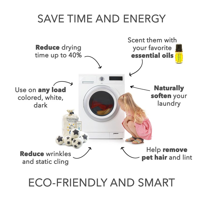 Friendsheep Eco Dryer Balls will soak up moisture in your dryer by absorbing up to 30% of their weight in water. Plus, their movement in the dryer will help separate your clothes and sheets allowing air and heat to circulate and dry them faster. As your laundry dries, the dryer balls will fluff and evenly redistribute humidity in the dryer eliminating wrinkles, reducing static cling and providing a softer feel to your fabrics. The result is a quicker drying time, softer and more manageable laundry, all with less energy used, and more money in your pocket!