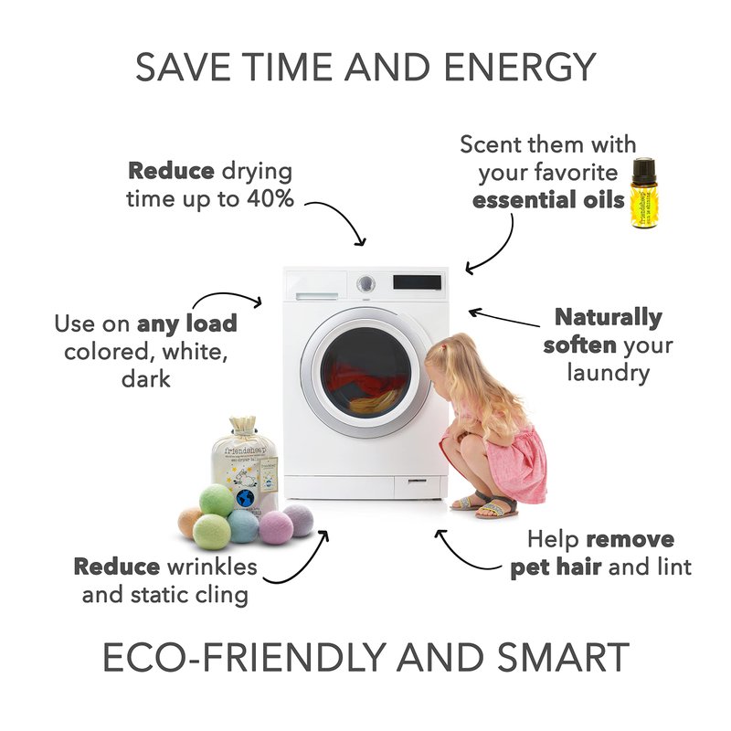 Friendsheep Eco Dryer Balls will soak up moisture in your dryer by absorbing up to 30% of their weight in water. Plus, their movement in the dryer will help separate your clothes and sheets allowing air and heat to circulate and dry them faster. As your laundry dries, the dryer balls will fluff and evenly redistribute humidity in the dryer eliminating wrinkles, reducing static cling and providing a softer feel to your fabrics. The result is a quicker drying time, softer and more manageable laundry, all with less energy used, and more money in your pocket!