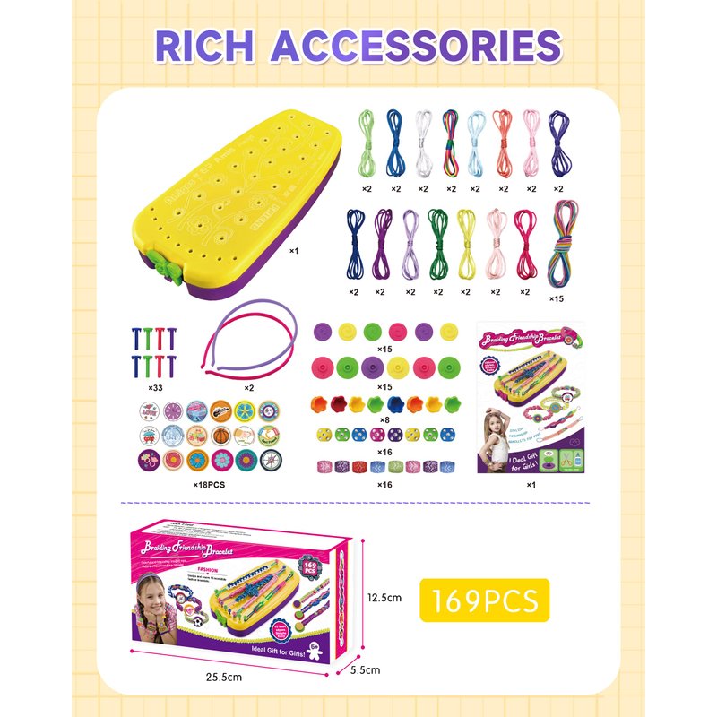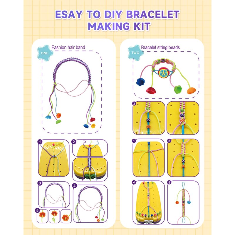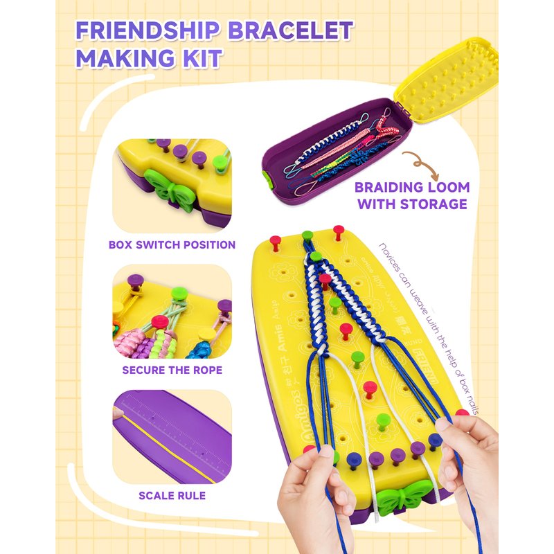 Friendship Bracelet Making Kit : Contains 1 portable bracelet loom, 30 bracelet strings, 15 strong rubber bands, 30 cartoon buckles, 18 pattern stickers, 33 colourful pegs,2 plastic headbands, and 40 extra beads. It also comes with a step-by-step instruction guide with illustrations to help you get started quickly.