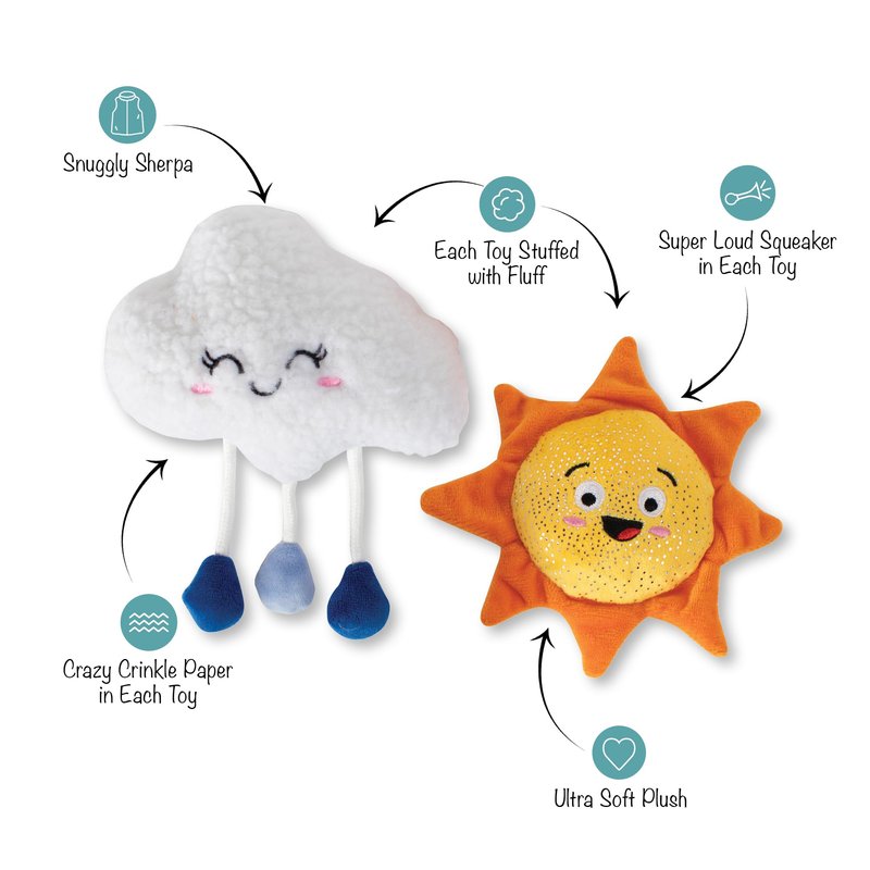 - Each toy is approximately 6.25” x 5.5” ( SUN: 5.5" X 5.5", CLOUD: 7" X 5.5")