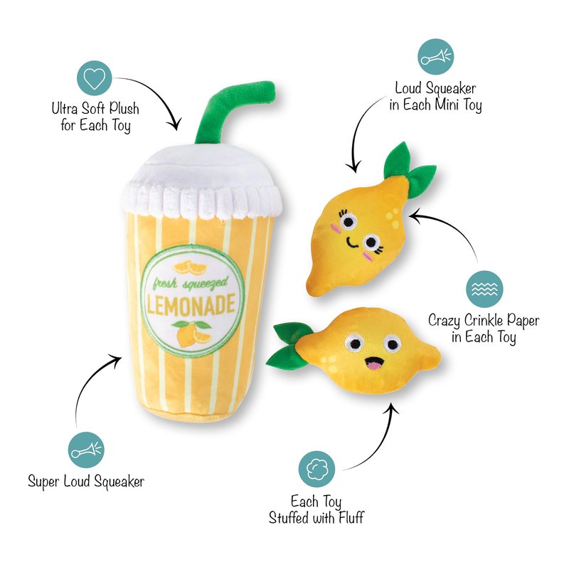 - Large toy is approximately 4.5” x 9”, Each mini toy is approximately 3.75” x 3.75” ( LEMONADE: 9" X 4.5" X 4.5", HAPPY LEMON: 5" X 2.5", SHOCKED LEMON: 2.5" X 5")