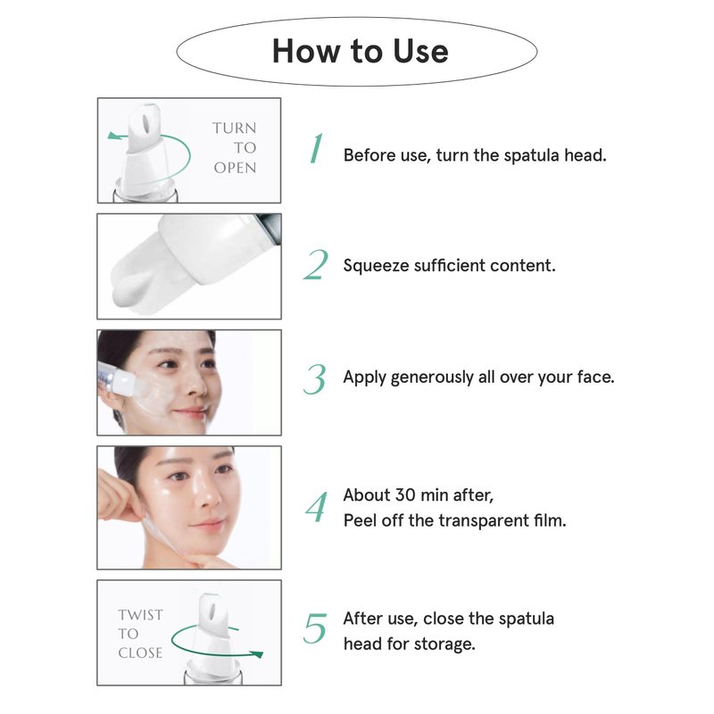 - HOW TO USE: Cleanse your face thoroughly before use. Apply an even layer of the product using the built-in spatula. Allow it to set for thirty minutes. Once completely dry, gently peel it off to reveal a revitalized complexion. Please note that this is NOT A WASH-OFF mask. For optimal results, enjoy this ritual into your daily skincare routine for a radiant & rejuvenated skin.