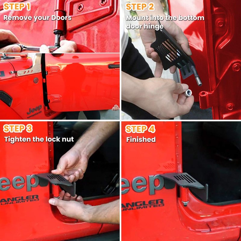 - Easy Install & Clean — No drilling required. No damage to your car. Easily mount into the bottom door hinge and then tighten the lock nut (Need to Remove your Doors). Easy & Quick clean by water and make it look new for a long service life.