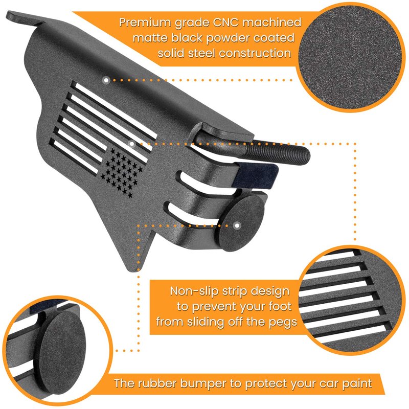 - Perfect Upgrade — Compliment your car's sleek and stylish look with this foot pegs. Non-slip strip and an extra bend design prevent your foot from sliding off the pegs, especially in muddy and wet conditions. Designed with rubber bumper on the side to prevent scratches on your car paint.