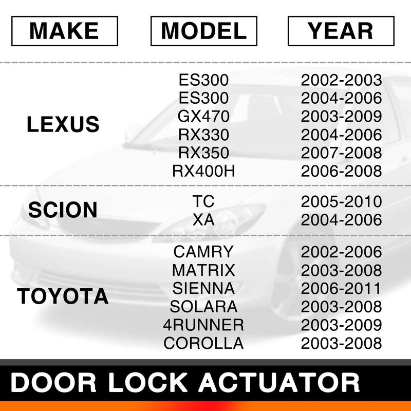 - Direct Fit: Replacement for Toyota Corolla/Matrix/Solara 2003-2008, 4Runner 2003-2009, Camry 2002-2006, Sienna 2006-2011; Replacement for Scion tC 2005-2010, xA 2004-2006