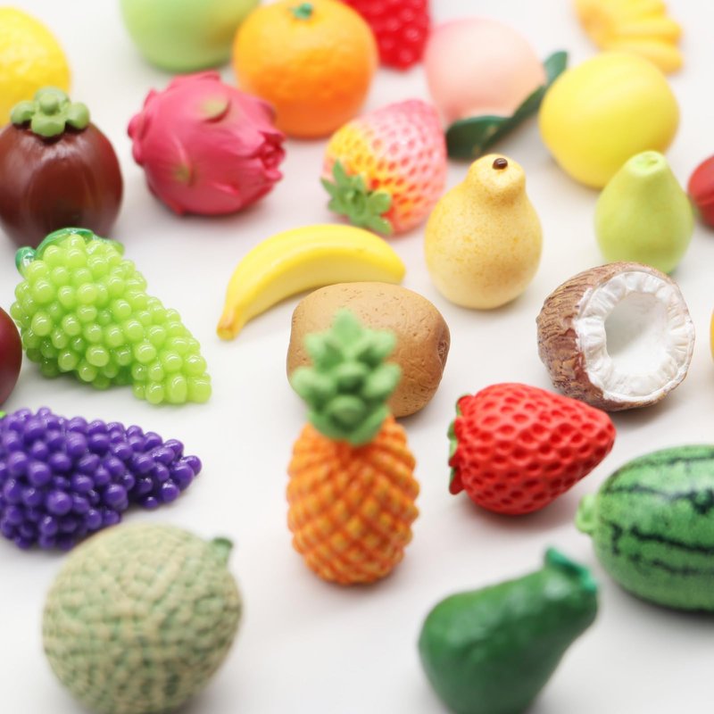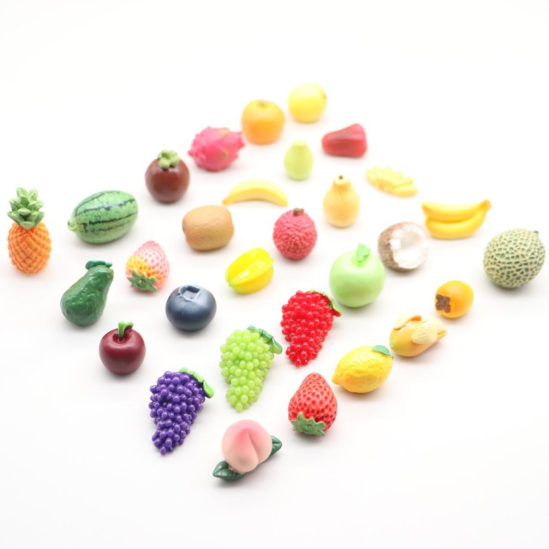 - Including: mini resin ornaments such as watermelon, grapes, lemons, peaches, strawberries, avocados, pineapples, bananas, blueberries, bananas, mangoes, etc