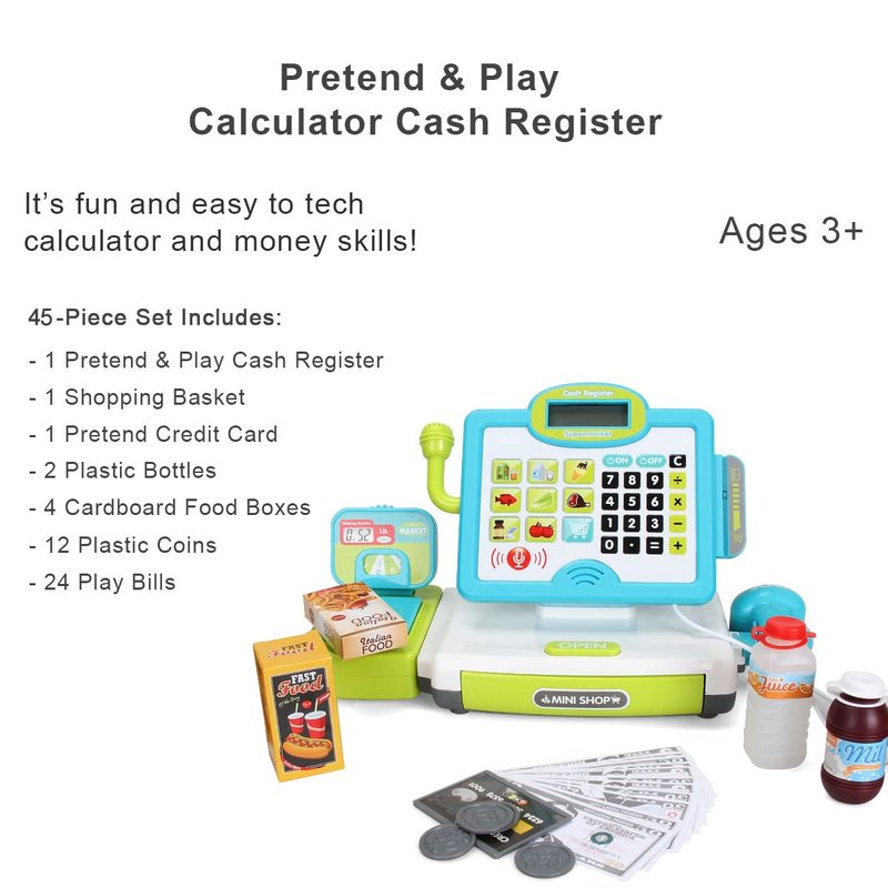 - With Calculator Function - The cash register toy has a built-in calculator, play with this cash register to learn about money, math or counting and make learning about money and numbers and counting skills more fun.