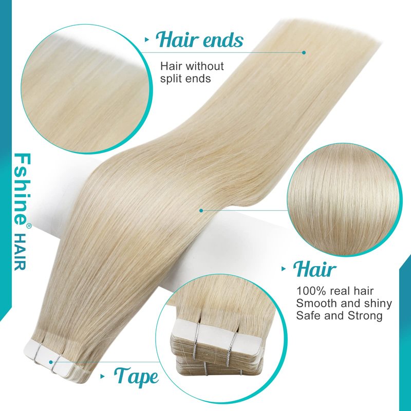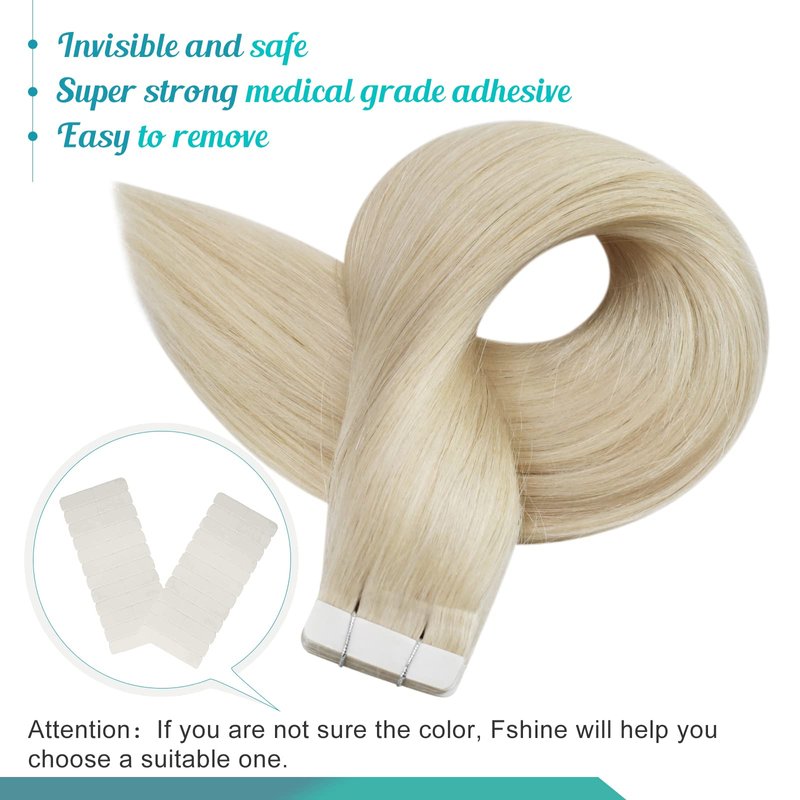 Fshine Tape in Hair Extensions Human Hair Color 60 Platinum Blonde Seamless Skin Weft Tape Ins Human Hair Extensions 20 Pcs Pu Tape in Hair Extension White Tape Adhesive in Extensions 50 Grams