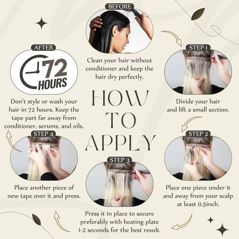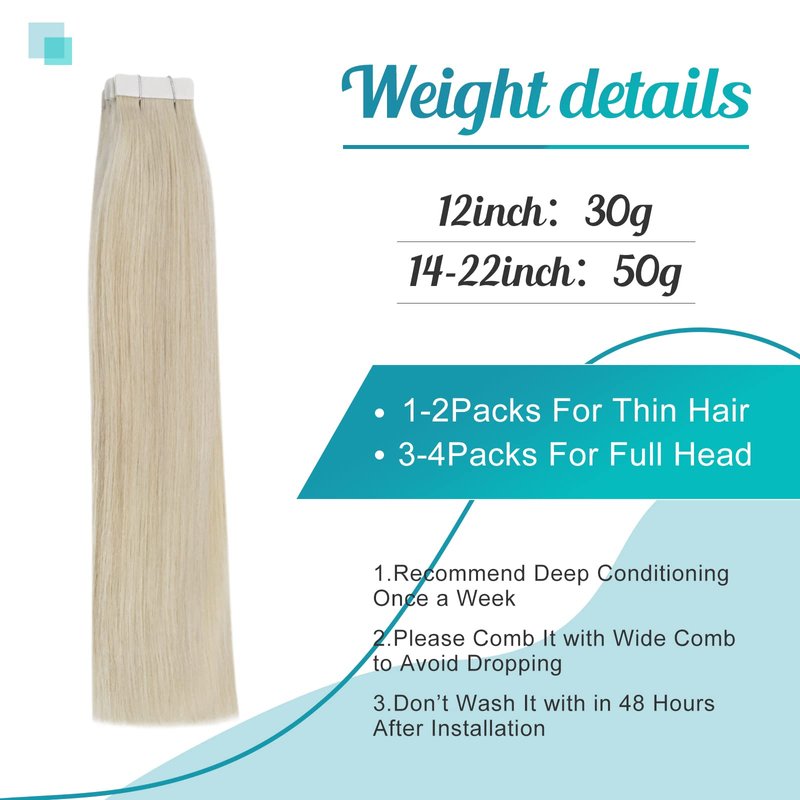 - 【Washing Tips】Wash your tape human hair extensions with mild shampoo. Don't use a hair dryer, let the hair air dry. Comb your hair with a wide-tooth comb, regularly deep-condition your hair extensions. We recommend to wash hair once a week.