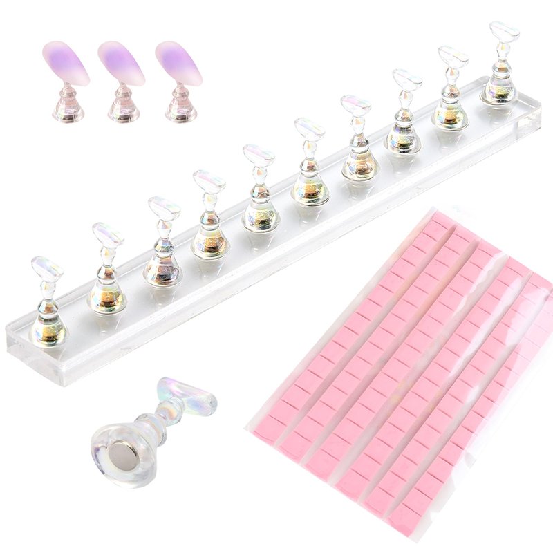 - * Pack your nail dreams in one box - each set includes 10 clear nail tips, a rectangular clear nail stand and 96 pink sticky putty square. These are more than enough tools for your daily nail practice or presentation needs.