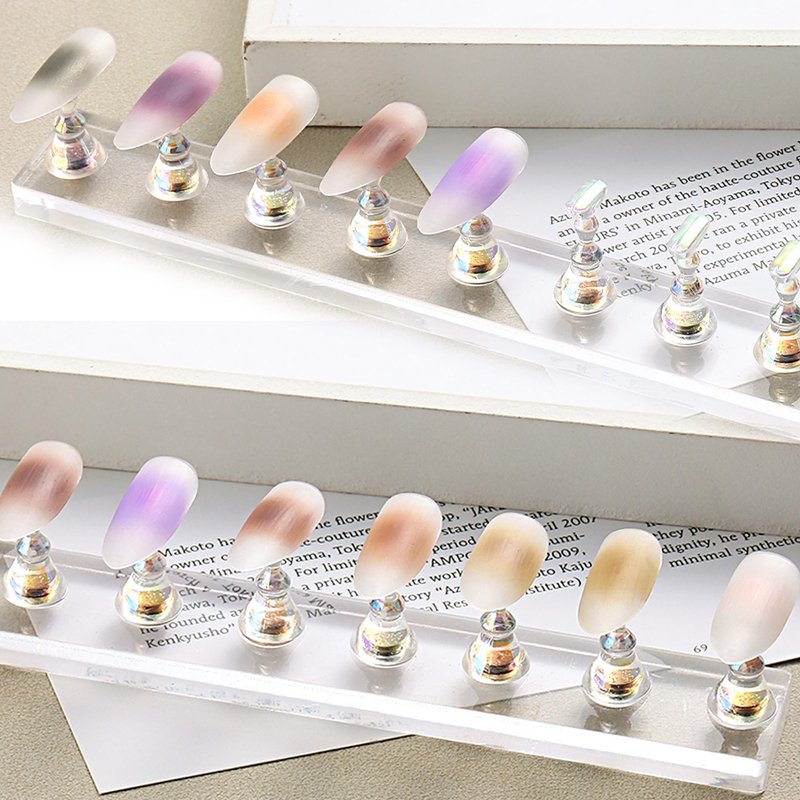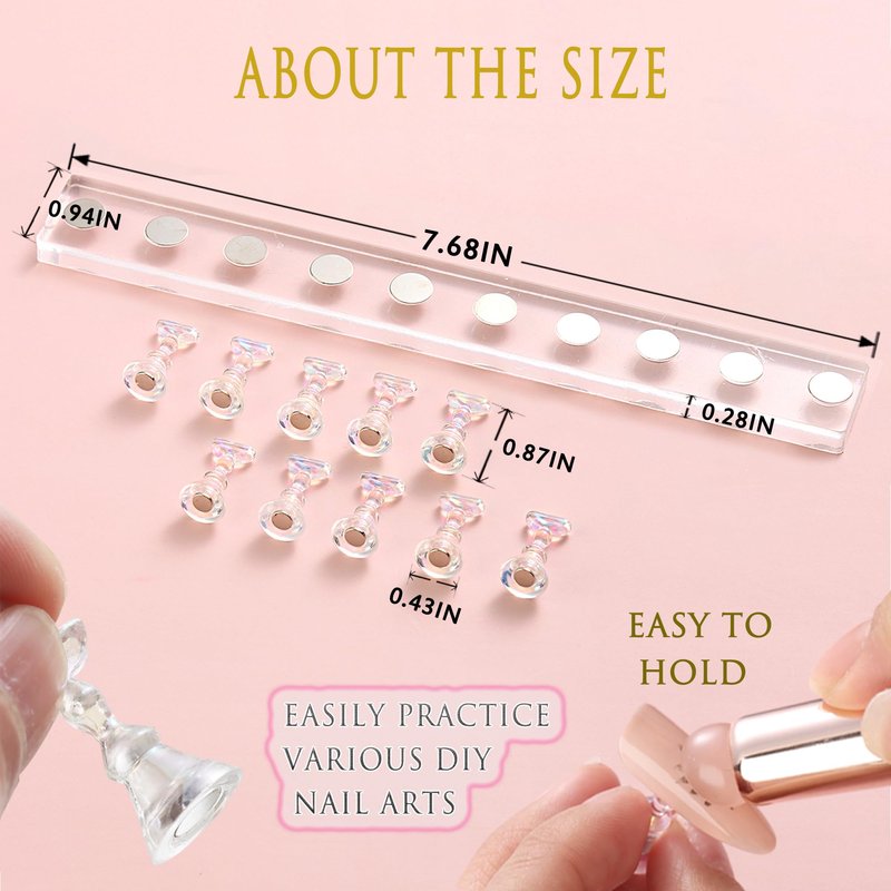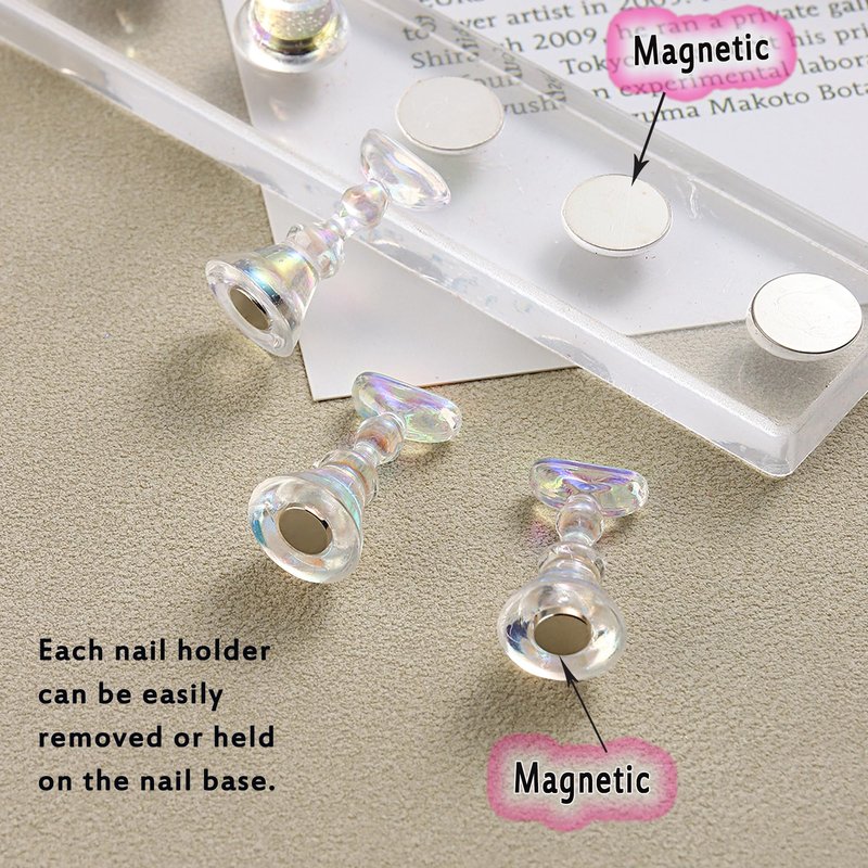 - * Magnetic design, easy to operate - the fake nail holder has a smart magnetic design. Each small seat and base is equipped with a metal magnetic surface that makes it easy to secure the acrylic base and iron pieces to the top. With this magnetic feature, you can operate and display your manicure effortlessly.