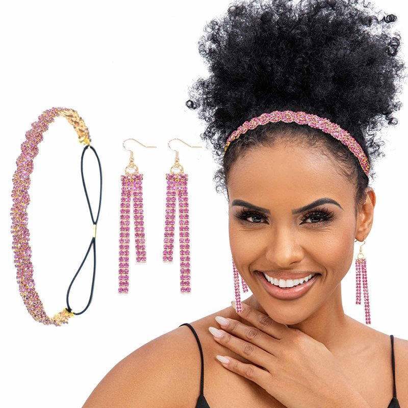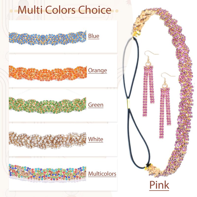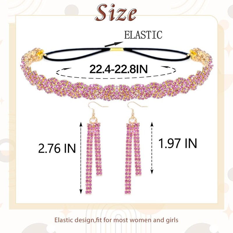 Fstrend Braided Rhinestones Elastic Headband Tassel Earrings Set Gold Crystal Hairbands Eardrop Sparkle Head Chain for Women(Pink)