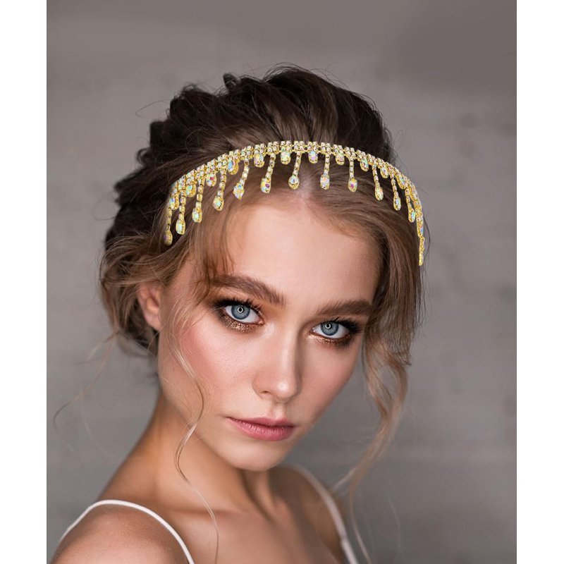 Fstrend Rhinestone Head Chain Tassel Elastic Crystal Hair Band Forehead Bridal Headband Prom Headpieces for Women (AB Gold)