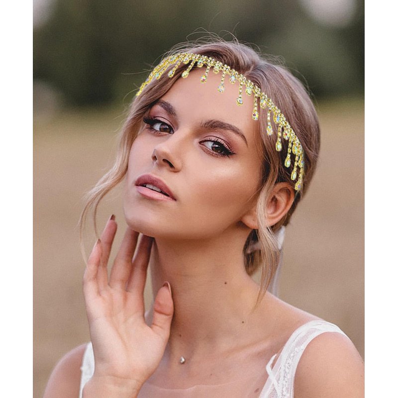 Elevate your style with the Fstrend Rhinestone Head Chain Tassel Forehead Bridal Headband. This exquisite headpiece features an elastic crystal hair band adorned with sparkling rhinestones and elegant tassels, creating a captivating and glamorous look.